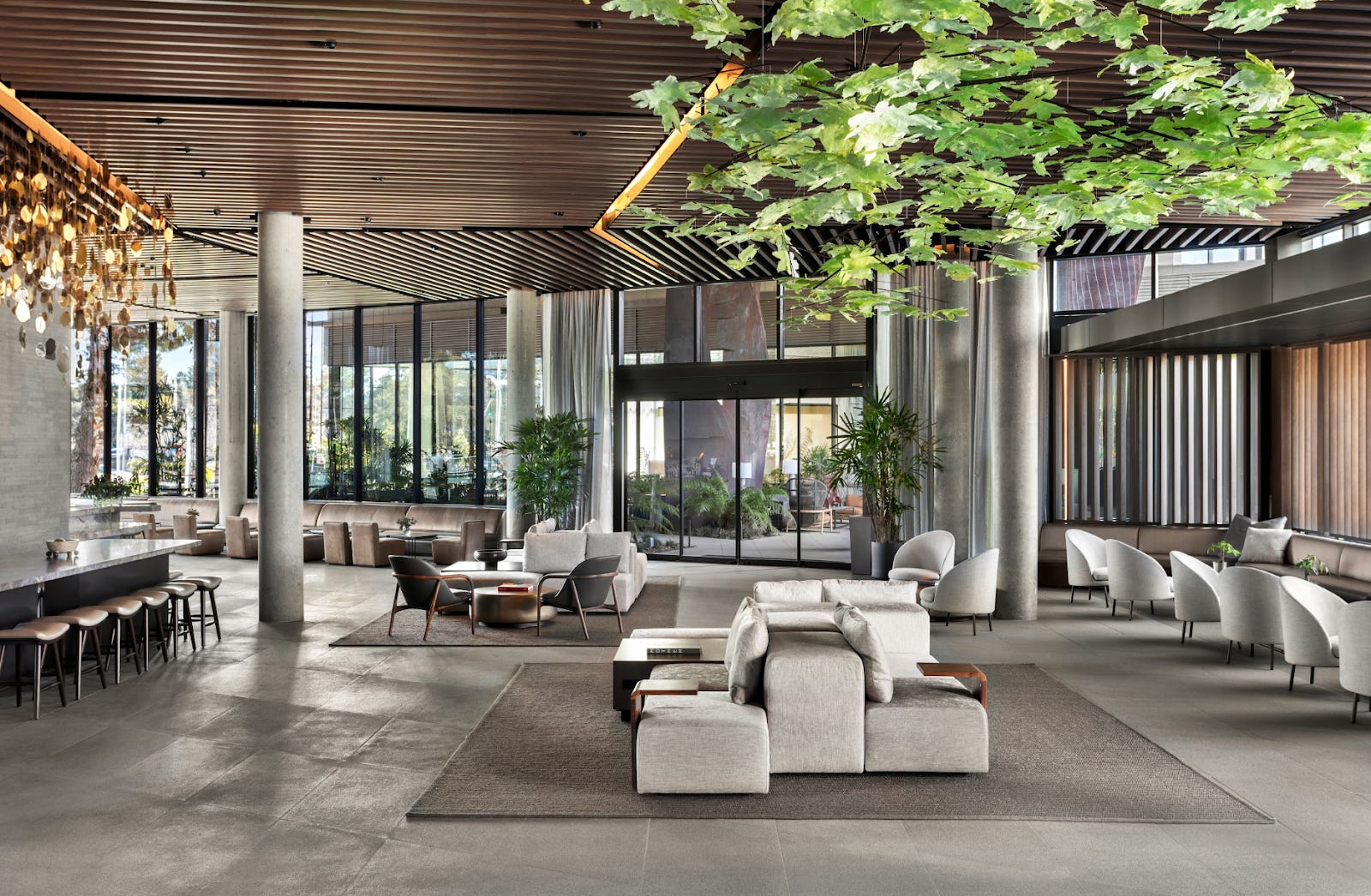 The Gabellini Sheppard-designed, 200-key hotel has all the trappings of tech luxury (Peloton bikes, Dyson hairdryers, Nespresso coffee machines), as well as an outdoor atrium where stylish loungers and fire pits share space with cornhole and giant Connect Four boards.
