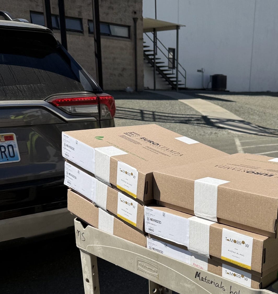 The afternoon is for production and wine logistics activities: We’re bottling our 2025 Rhone Blanc in early April, so we’re finalizing all the details. Used my “mobile office” to deliver our labels to our local bottler so everything is staged and ready. After that, I’m back at my desk working on final decisions for our newest sparkling wine bottling in June.